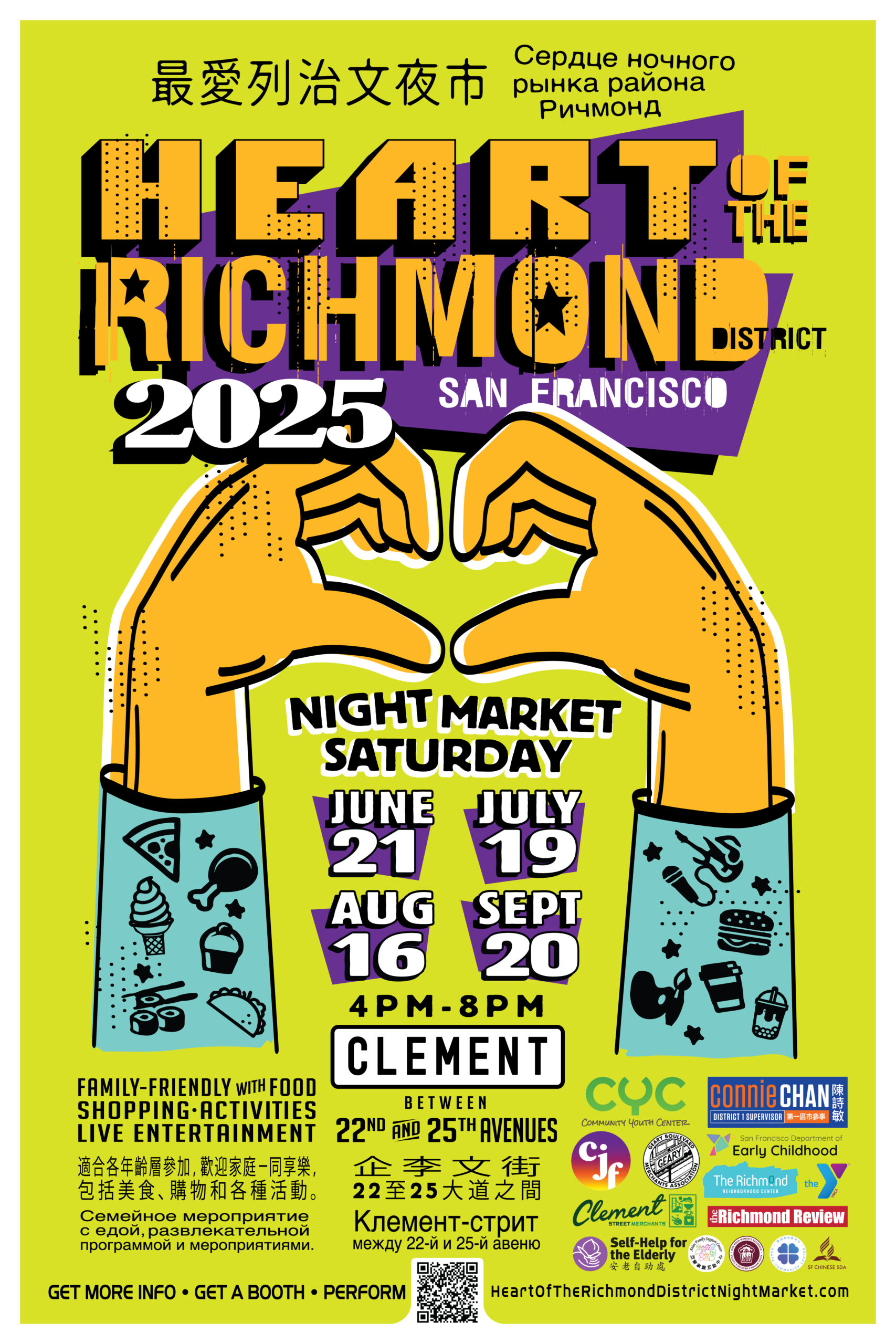 Saturday, Aug. 16: The Heart of the Richmond District Night Market, second of a series of four family-friendly night markets will take place in the Richmond District on Saturday, from 4 to 8 p.m. This event will repeat on Saturday, Sept. 20.