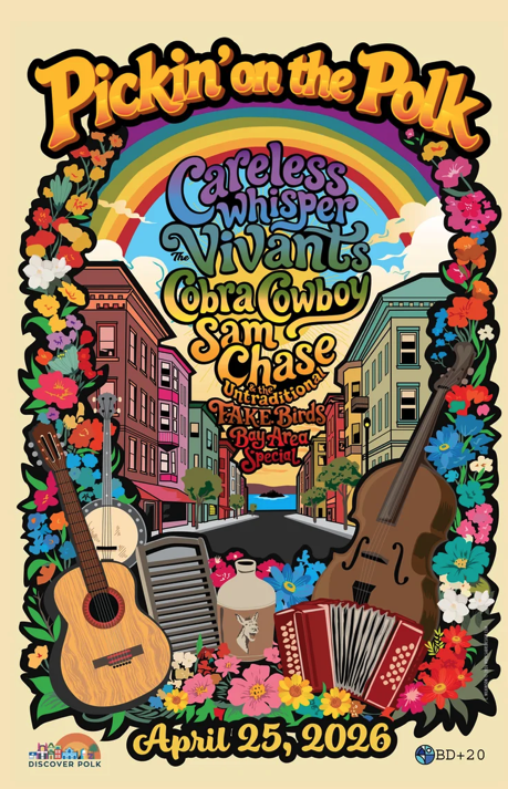 Saturday, April 25: A musical event will take place on Polk Street from Noon to 10 p.m. For more details see https://www.pickinonthepolk.com/.