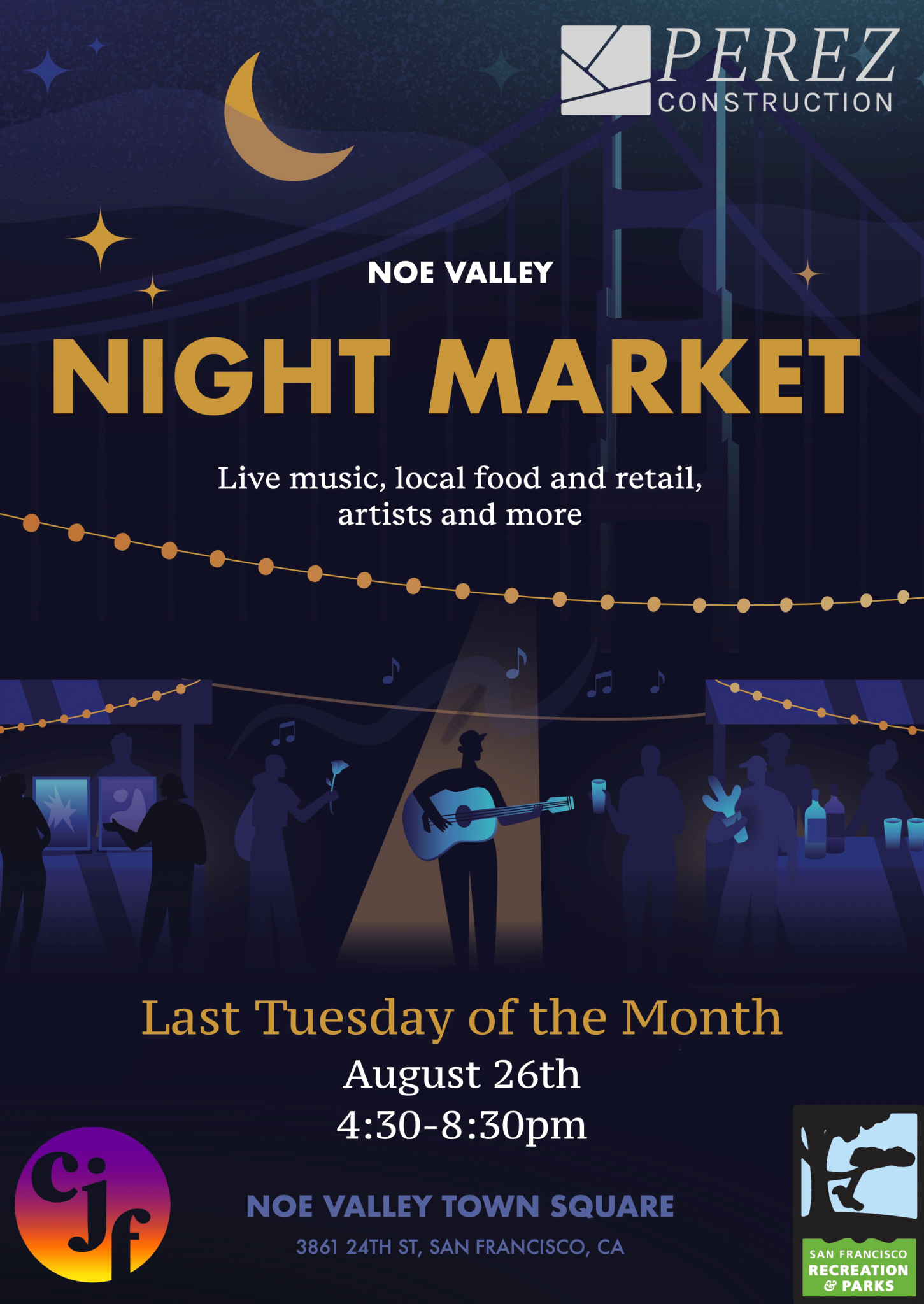 Tuesday, Aug. 26: The Noe Valley Night Market will take place on Tuesday, Aug. 26, from 4:30 to 8:30 p.m. This event will take place on 24th Street. between Sanchez and Vicksburg streets. For event details visit noemerchants.com.