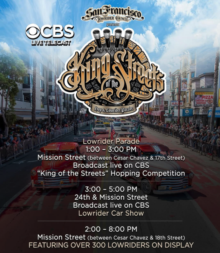 Saturday, Sept. 20: The San Francisco Lowriders Council will host the King of the Streets lowrider car show and cruise along Mission Street and through the local area. Lowriders will gather at 4 p.m. on Mission Street between Cesar Chavez and 22nd streets. This year, the event will be broadcasted by KPIX.