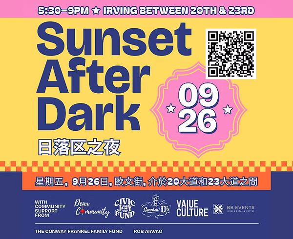 Friday, Sept. 26: Sunset After Dark is a family-friendly market showcasing the Sunset’s unique culinary and cultural diversity. This event will take place on Irving Street between 20th and 23 avenues, from 5:30 to 9 p.m. For more information, visit www.dearcommunity.org/sunsetafterdark.