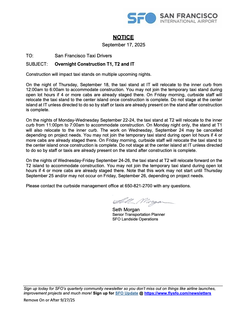 NEWS : SFO Overnight Construction T1, T2 and IT NEWS : SFO Overnight Construction T1, T2 and IT September 17, 2025 Bob Cassinelli September 17, 2025 Categories:NEWS